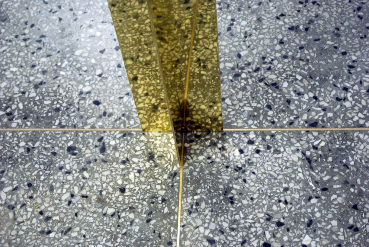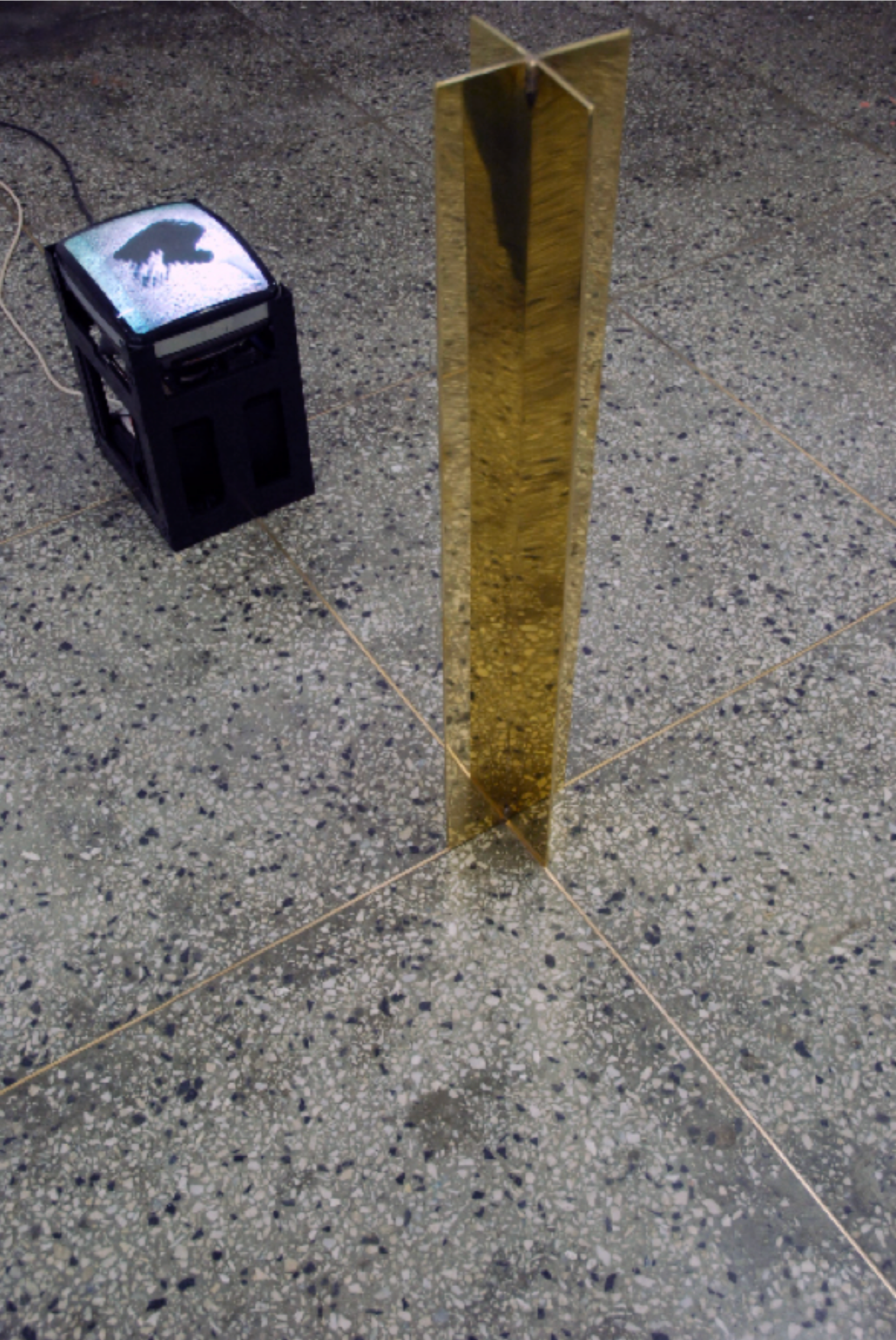 Originally, a 4.5cm thick bronze sill existed, marking the boundary of the floor in the building. The artist created a bronze sill of the same thickness in the form of a 1-meter height, installing it aligned with a cross-shaped line. Next to it, a monitor was placed facing the ceiling. The monitor continuously plays a video recorded at the same location. The footage was captured by the artist jumping as high as possible over the floor’s boundary line. The image of the person disappearing from the screen and reappearing repetitively was edited with “one frame” editing, creating a trembling effect as if floating at the highest point of the jump.