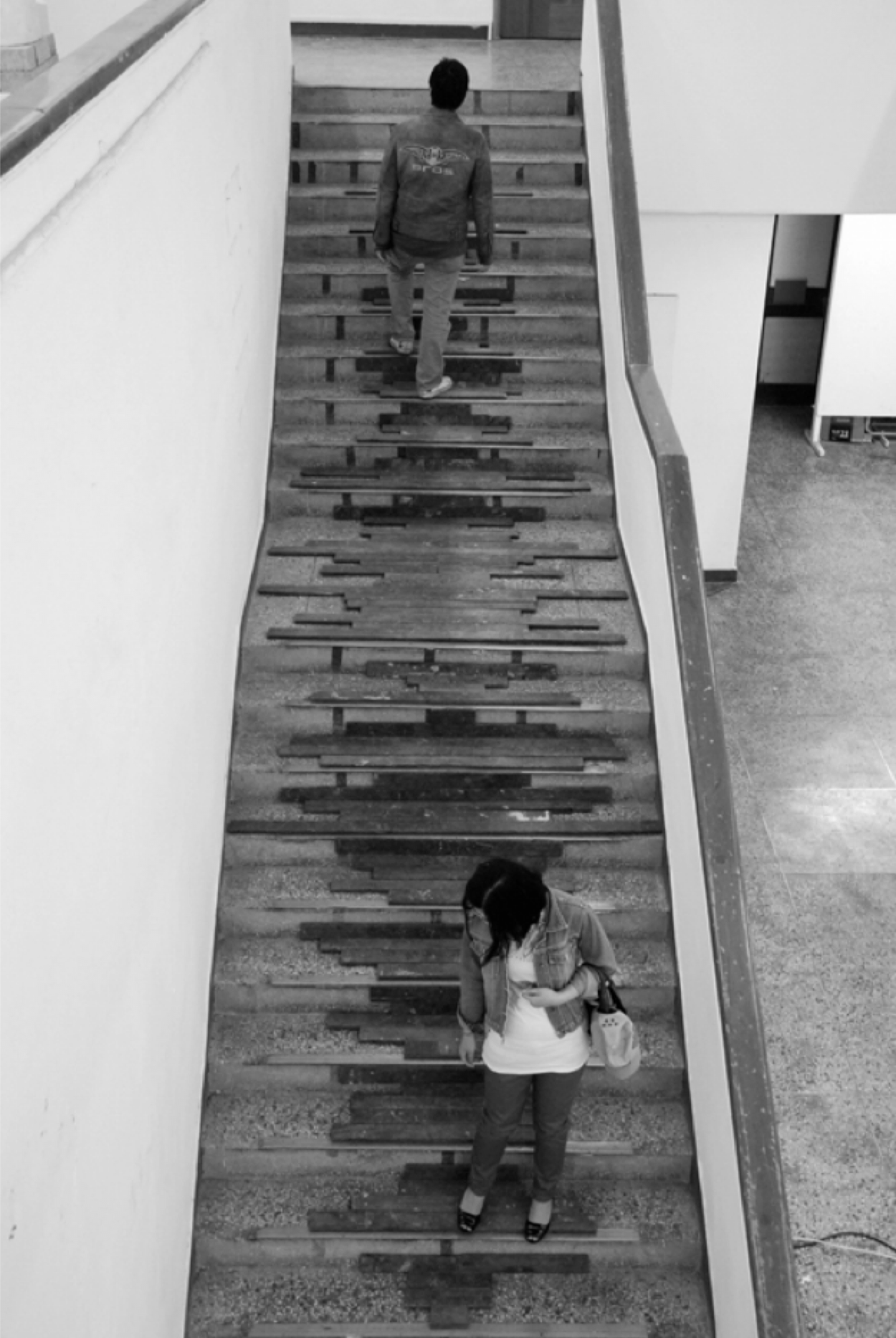 The long-used wooden flooring retains the marks of paint and bears the traces of time. This installation work connects discarded pieces of this wooden flooring together, forming additional stairs within the stairs in the shape of sound waves, as if bridging them like legs. As viewers pass through these stairs, they simultaneously observe the stairs from a higher point, and their own image passes horizontally on the monitor below, captured by the surveillance camera. The monitor is placed sideways to allow viewers to see their own image, as if their journey up the stairs is included within a wooden bridge or the shape of sound waves. As people pass by, they experience the distinctive creaking sound inherent to wood, evoking memories of childhood memories of polishing wooden steps and the traces of time brought by the marks of paint. It is expected to evoke not only the physical sound waves that are heard but also memories reminiscent of past sounds that exist within our memories, akin to auditory hallucinations.